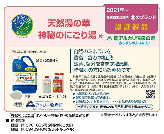 天然湯の華【神秘のにごり湯】は2012年より北のブランドに認証されています。