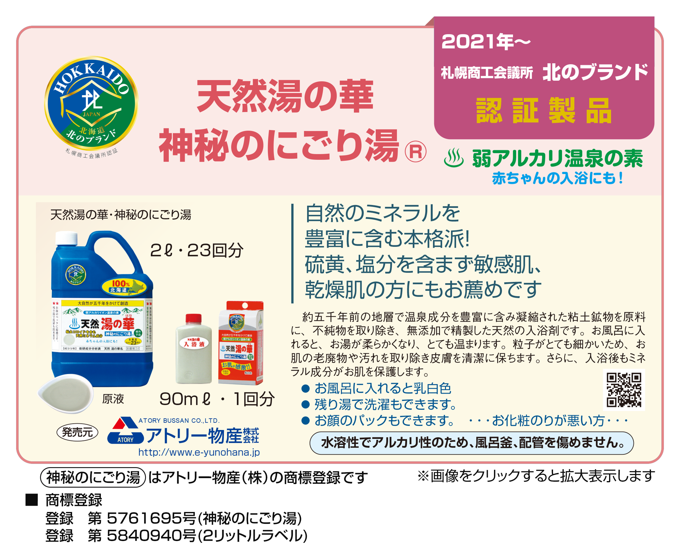 天然湯の華【神秘のにごり湯】は2012年より北のブランドに認証されています。